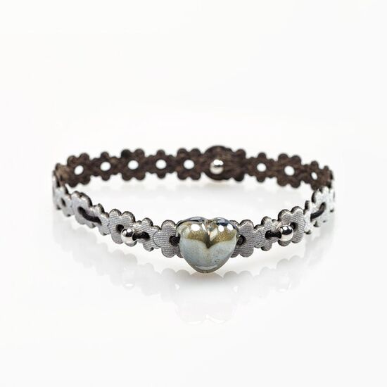 Ажурный кожаный браслет со вставкой в виде бусины из муранского стекла,со сверкающим эффектом, в форме сердца.